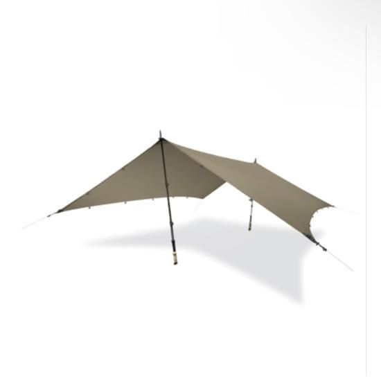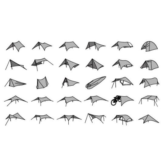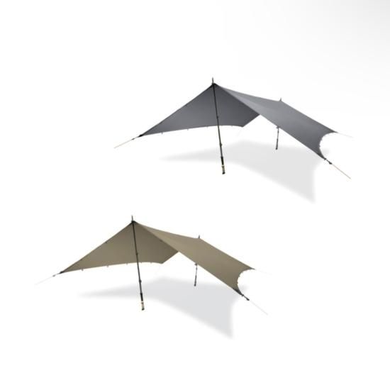 手裏剣シルエット。前後2辺のテンションスリーブ。21か所ものジョイントポイント。これらのユニークな機能により圧倒的な張りやすさと設営バリエーションを実現。軽量コンパクトさとあいまってタープの可能性を広げます。