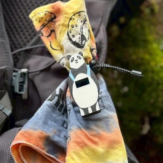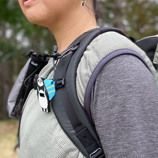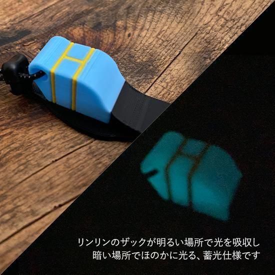CLAMPオリジナルキャラクター〈リンリン〉がザックを背負った、蓄光仕様のエマージェンシーホイッスル。